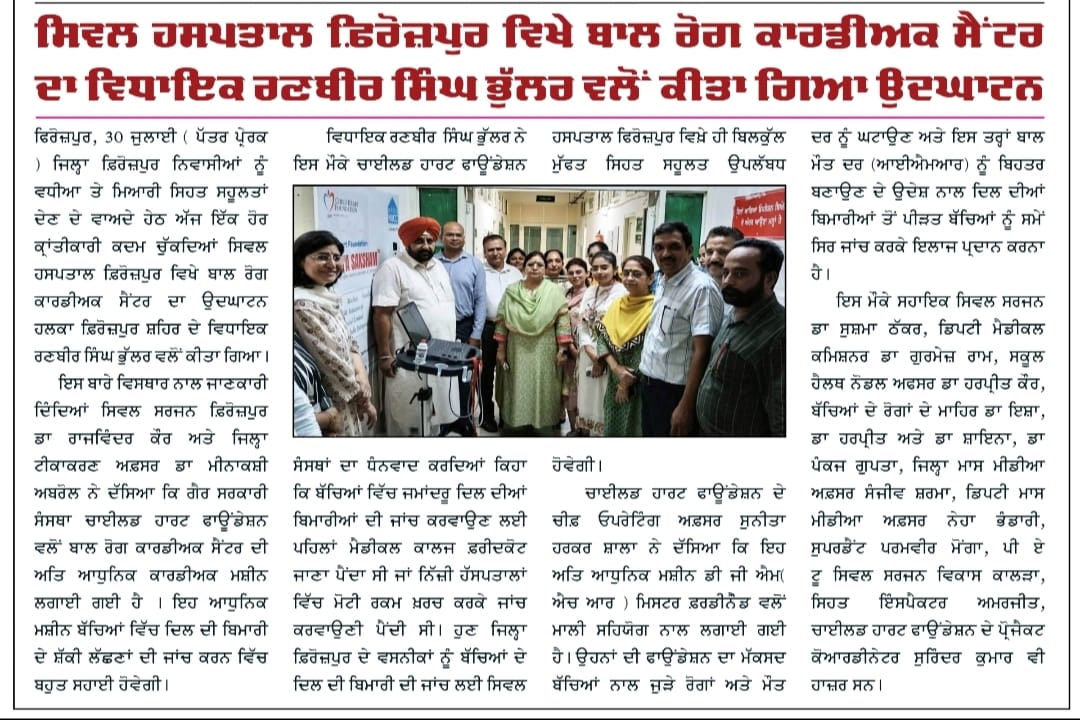 Echo Machine Installed at Civil Hospital, Firozpur by Child Heart Foundation Under NBCC (India) Ltd.’s CSR Initiative